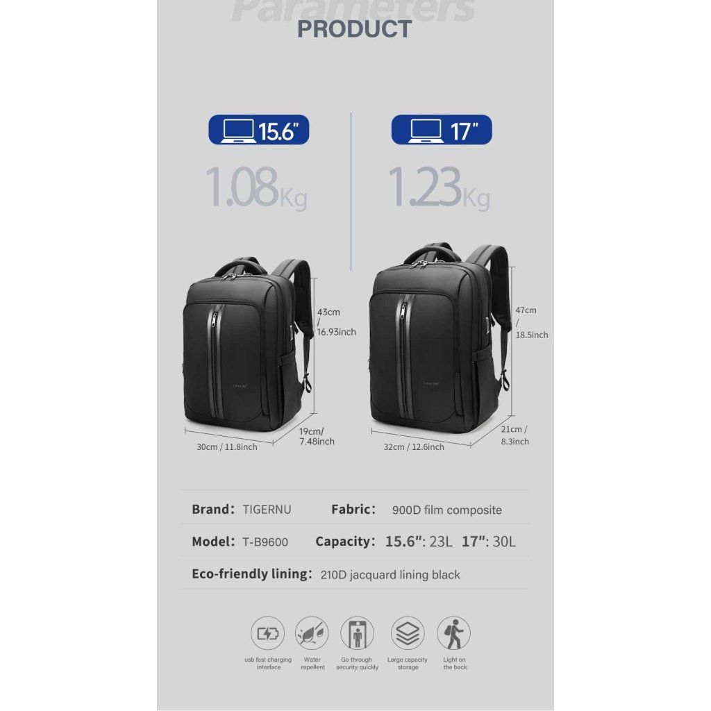 Městský batoh Tigernu T-B9600 nabídne množství prostoru pro uložení vašich cenností a místo pro až 17palcový notebook. Tři velké kapsy se postarají o uložení všech věcí a měkké polstrování na zádech a popruzích zase o pohodlné nošení.