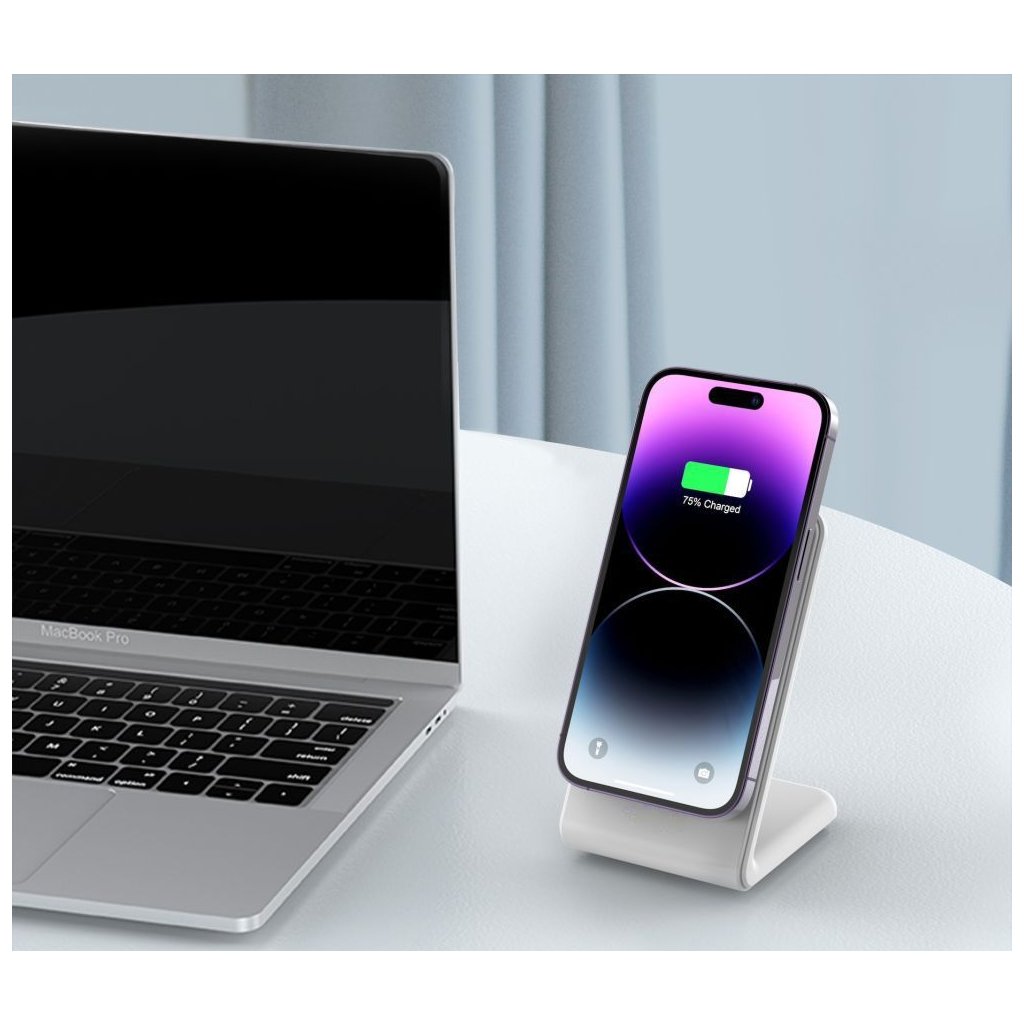 Inovativní konstrukce zahrnuje integrovaný stojánek, který umožňuje nabíjení v poloze vertikální i horizontální. Ať už sledujete filmy, procházíte sociální sítě nebo vedete videohovor, zařízení zůstává stále nabité a připravené k použití.