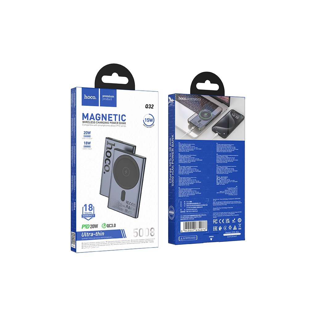 Powerbanka s MagSafe Hoco Q32 je obdařena magnety pro rychlé uchycení na záda iPhonu. Kapacita 5 000 mAh vystačí na více než jedno celé dobití telefonu. Dobije ale i drátově skrz USB-C nebo jako standardní bezdrátová nabíječka a vyniká krásným hliníkovým vzhledem.