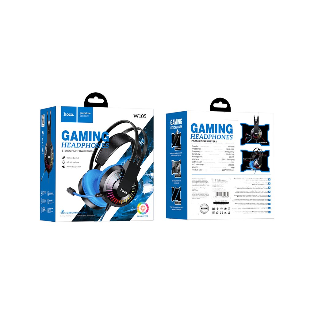 Herní sluchátka s mikrofonem Hoco W105 jsou velká a pohodlná sluchátka pro připojení k počítači pomocí USB nebo 3,5mm jack konektoru. S integrovaným mikrofonem perfektně poslouží jako headset na herní večery a barevný LED efekt upoutá i vaše spoluhráče.