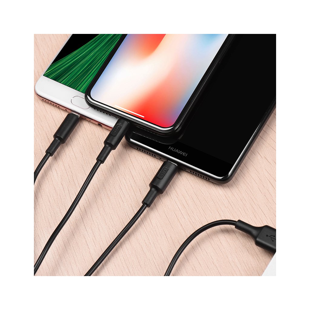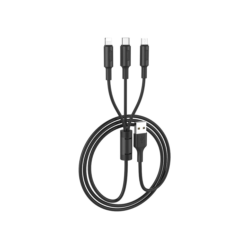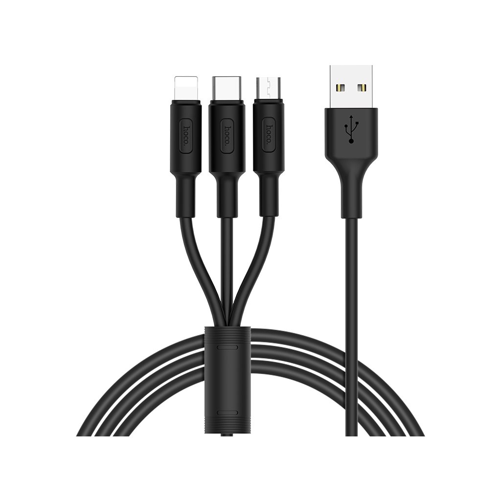 Nabíjecí kabel 3v1 značky HOCO, černé barvy. Má jednoduchý design. Kabel obsahuje 3 výstupy: lighting, micro-USB a USB-C. Díky tomuhle kabelu můžete nabíjet najednou tři zařízení jedním kabelem, čímž můžete ušetřit místo v USB výstupech. Také umožňuje jak nabíjení, tak přenos dat. Výstup je 2 A a délka 1m.