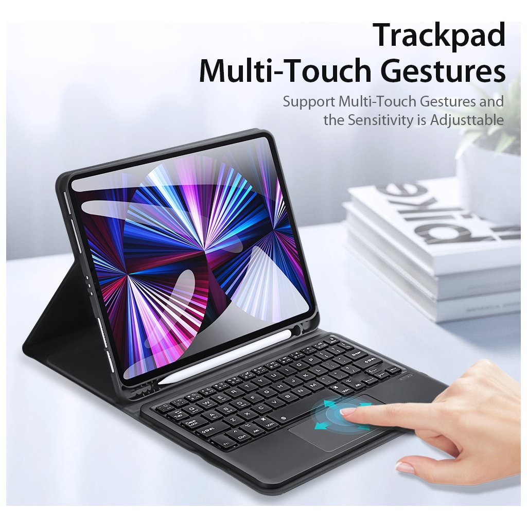 Klávesnice pro iPad DuxDucis TK Keyboard je multifunkčním zařízením, které zastane hned několik funkcí. Slouží primárně jako klávesnice, ale perfektně splní svůj účel i jako ochranné pouzdro, držák na Apple Pencil, nebo stojánek pro iPad. Pod klávesami naleznete i touchpad podporující vícedotyková gesta.