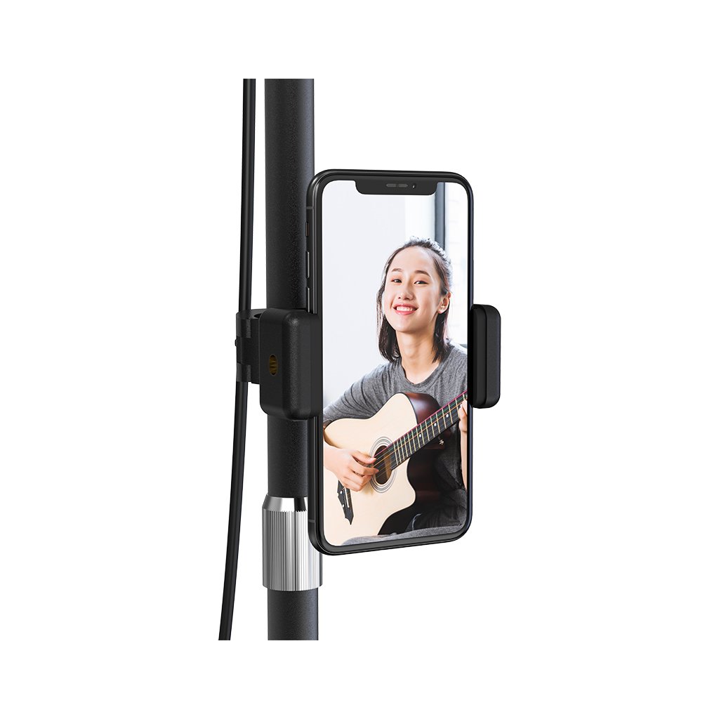 Držák na telefon pojme všechny velikosti moderních chytrých mobilů. Pomocí kleští ho jednoduše upevníte a ohebné rameno umístěné na středu kruhového světla si natočíte do požadovaného úhlu. Případně lze využít držáku, který se upevňuje na tyč stojanu.