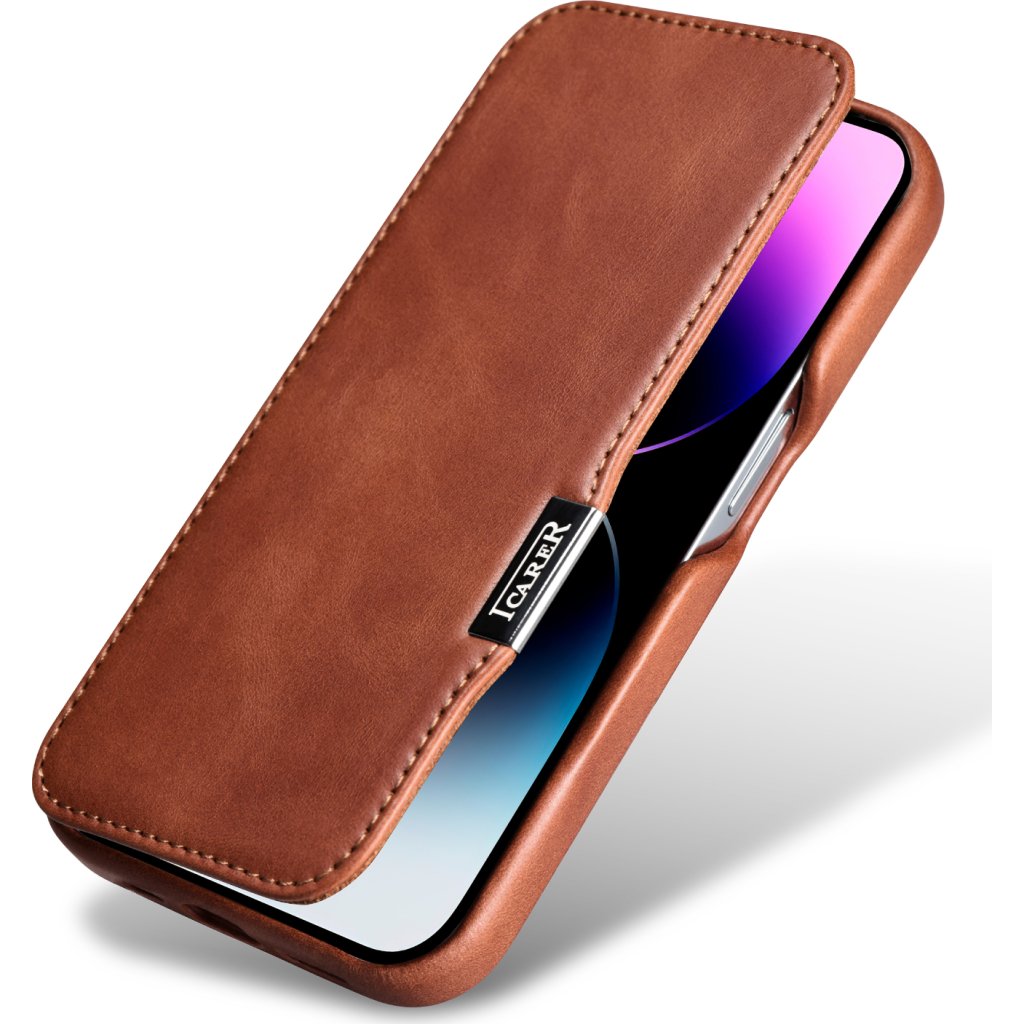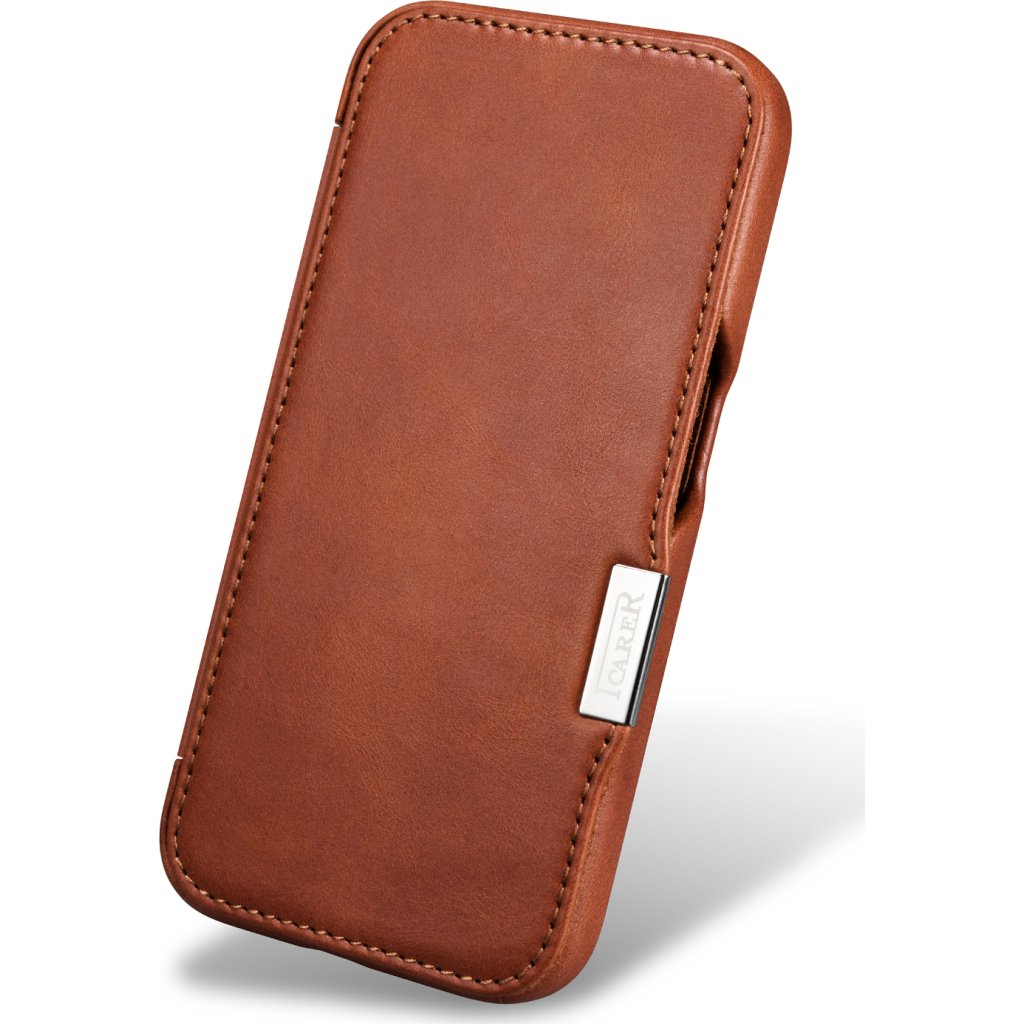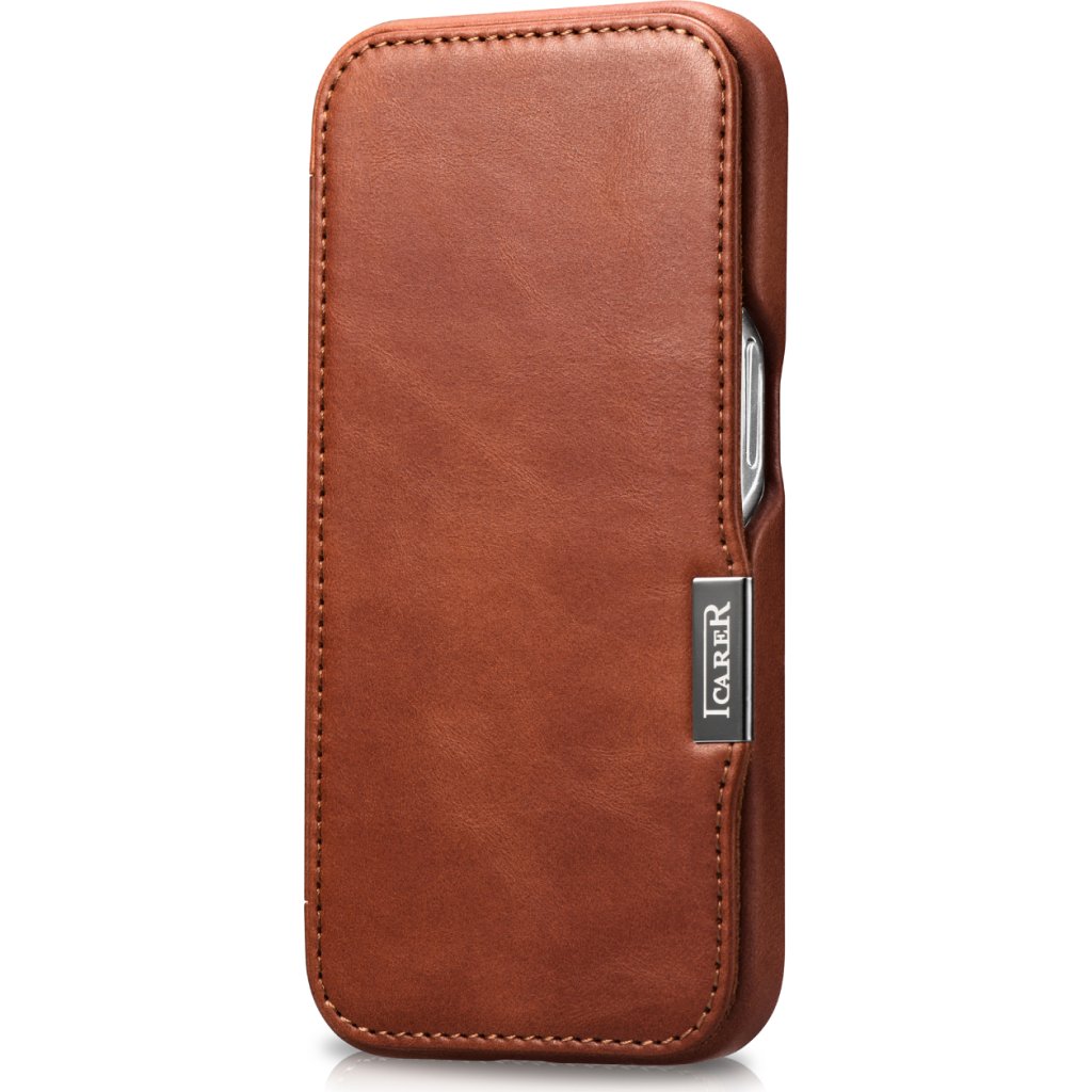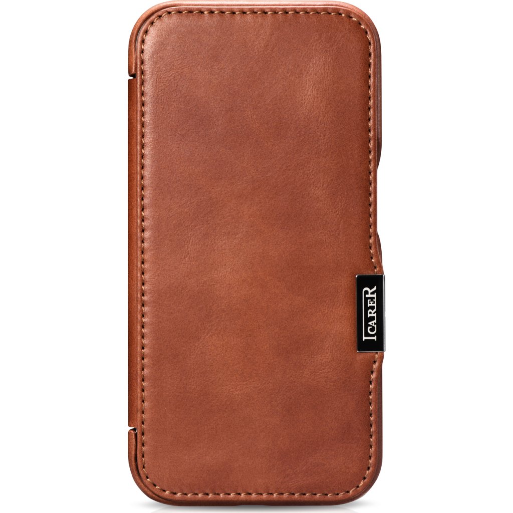 Knížkové pouzdro na iPhone 15 - iCarer, Oil Wax Real Leather MagSafe Brown