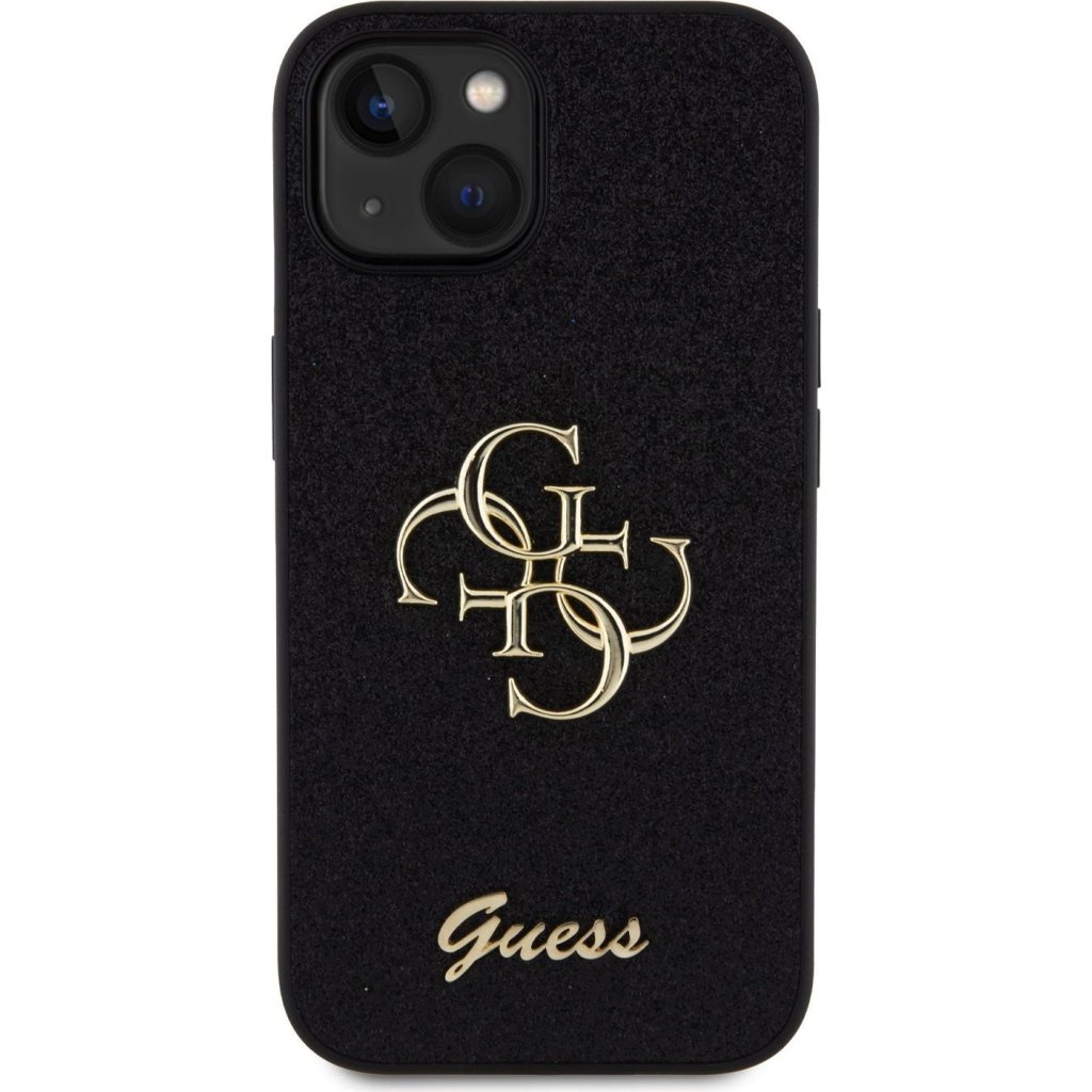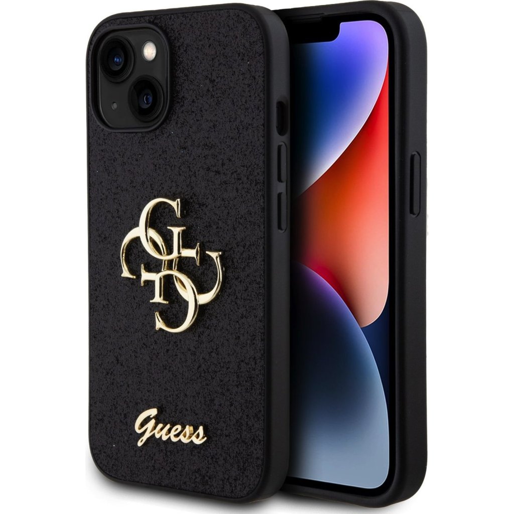 Ochranný kryt na iPhone 15 - Guess, Fixed Glitter 4G Metal Logo Black