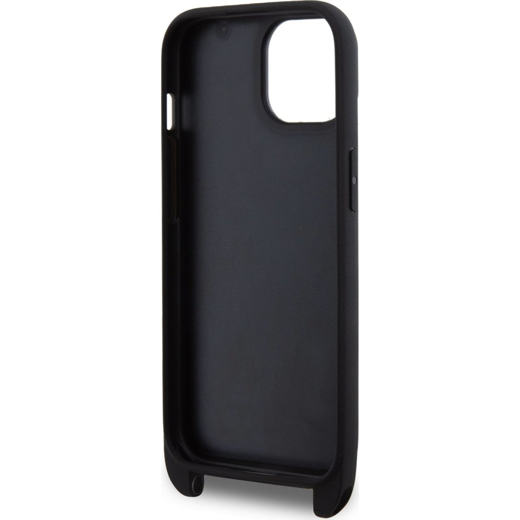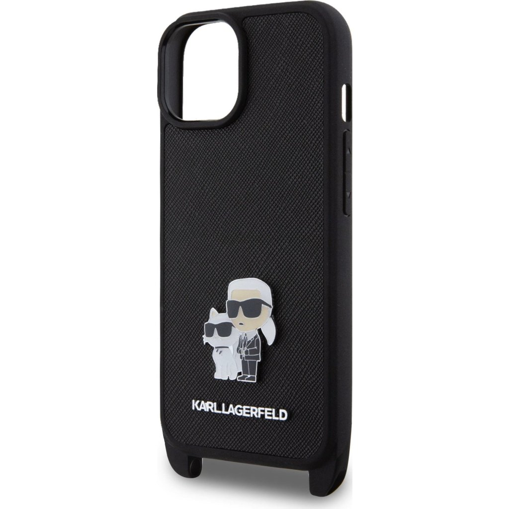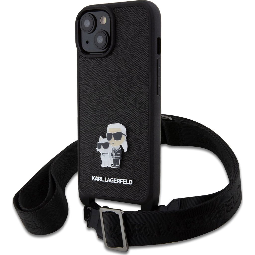 Ochranný kryt s crossbody popruhem pro iPhone 15 - Karl Lagerfeld, Saffiano Metal Karl and Choupette Black