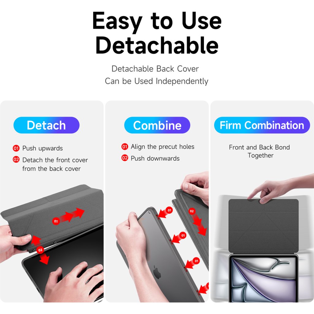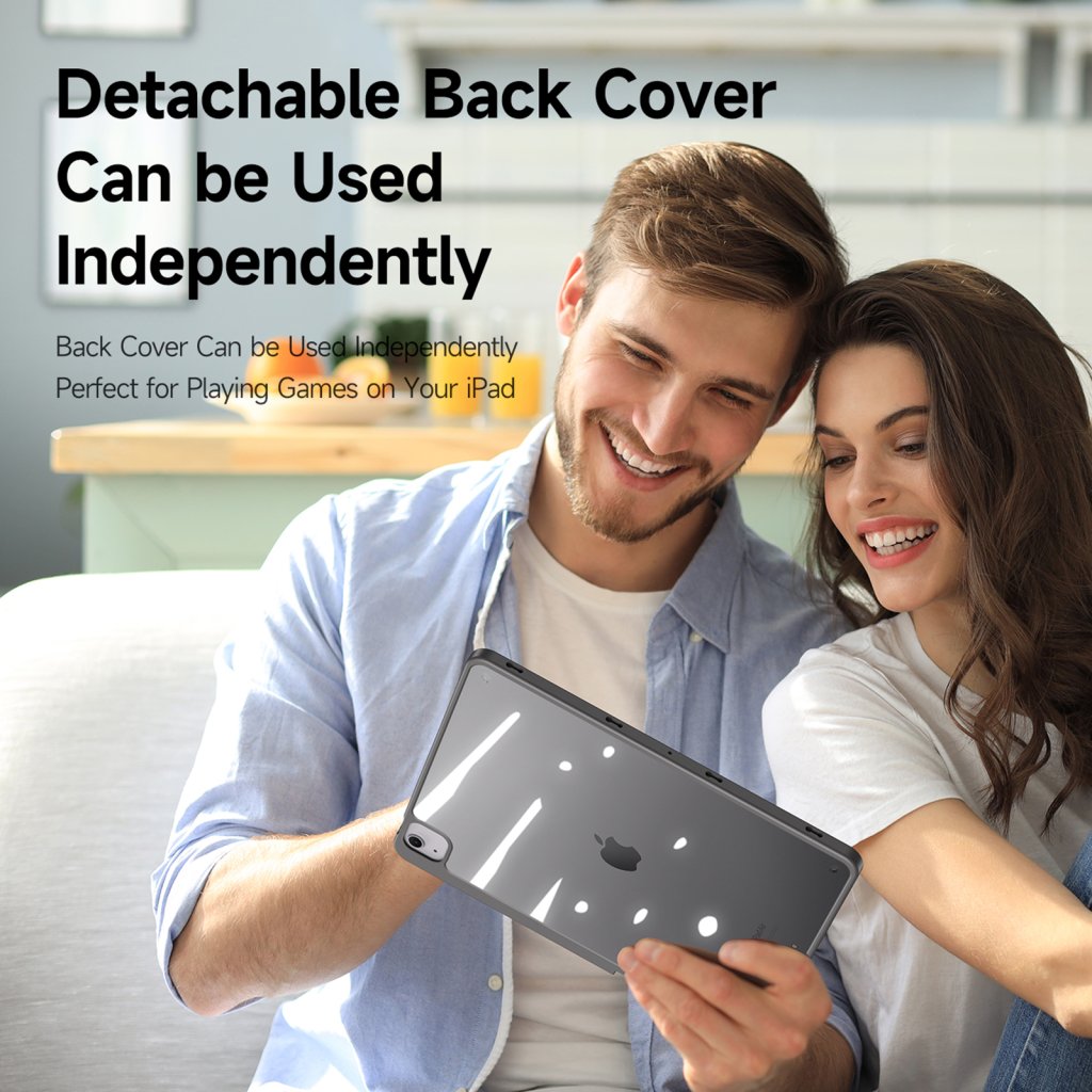 Kryt na iPad velmi rychle nasadíte a v plastovém obalu bude tablet perfektně držet. Záda jsou průhledná, takže vynikne originální design iPadu. Přední část se dá lehce skládat a při otevření se iPad automaticky rozsvítí. Zavření krytu zase displej zhasne a šetří tím energii. Navíc jde odpojit přední část a používat pouze kryt zad. Je to jen na vás.