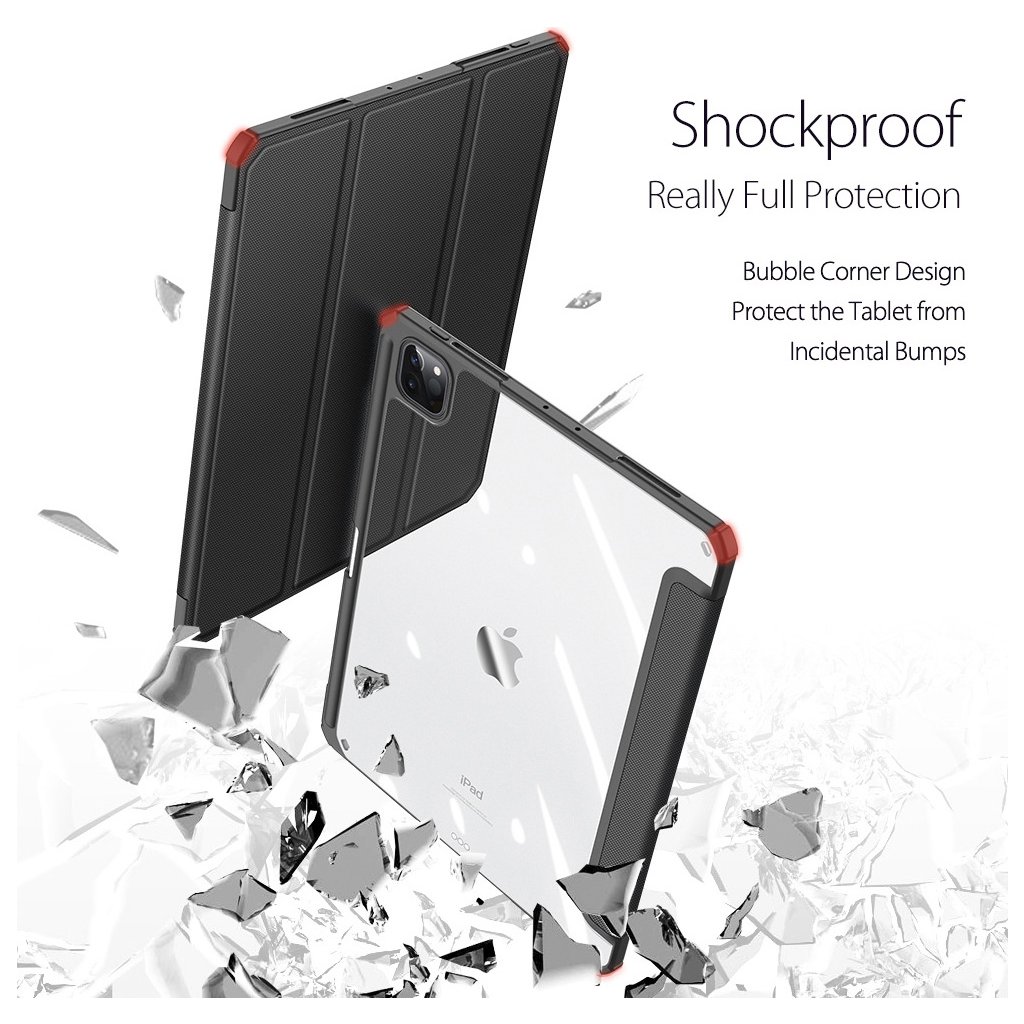 Ochranný kryt na iPad je opravdu odolný. Vyztužené rohy brání rozbití při pádech. Zadní část krytu je vyrobena z odolného plastu, který je velmi flexibilní a dokáže chytře rozvádět teplo tak, aby se zařízení v obalu nepřehřívalo. V rozích jsou chytře provrtány nenápadné otvory pro ještě lepší odvod tepla. Nemusíte se ani bát, že by se v krytu poškrábal zadní fotoaparát, protože obal přečnívá nad čočku a chrání ji. Navíc díky průhledné zadní části můžete nadále dávat na odiv krásu Apple tabletu.