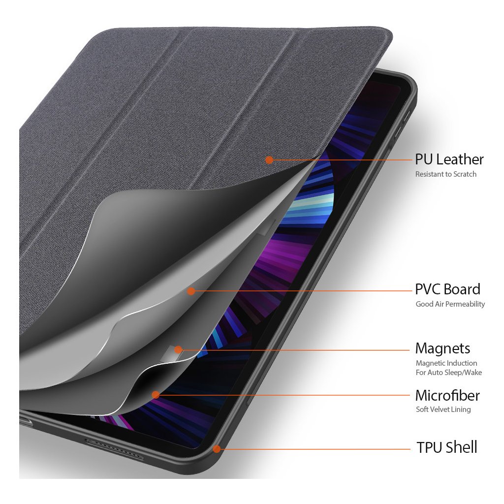 Elegantní pouzdro pro iPad Pro 12.9 (2022/2021) s magnetickým zavíráním, které je vyrobeno z vysoce kvalitní syntetické PU kůže se zesíleným šitím, které zaručuje vyšší odolnost. Pečlivě navržené a vyrobené s důrazem na přesnost. Knížkové pouzdro DUX DUCIS nabízí výbornou ochranu před náhodným vyklouznutím, poškrábáním a menším poškozením.