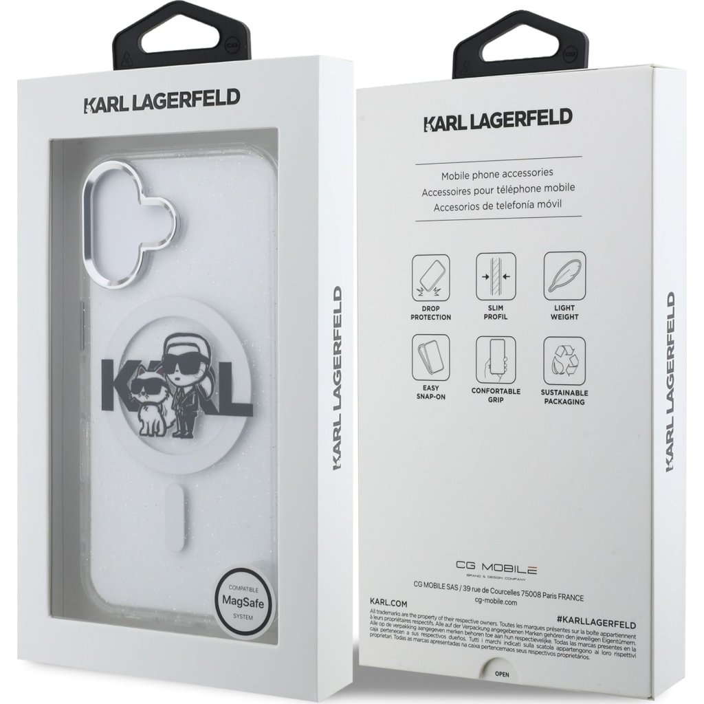 Karl Lagerfeld IML Glitter Karl and Choupette Sketch MagSafe zadní kryt je dokonalý doplněk pro váš telefon i outfit, který kombinuje funkčnost a styl v jednom.