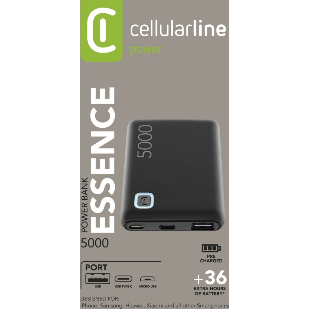 Powerbanka Cellularline Essense předtsavuje ideální záložní řešení na doplnění energie ve vašem telefonu a další elektronice. S kapacitou plných 5000 mAh a výkonem až 12W dokáže rychle a bezpečně dobít i nejmodernější smartphony. Powerbanka je vybavena USB výstupním portem pro připojení nabíjecího kabelu, pro dobíjení samotné powerbanky jsou připraveny USB-C a micro USB porty. Díky vysoce výkonným lithium-polymerovým článkům si i přes velkou kapacitu powerbanka zachovává kompaktní rozměry. Pogumovaný povrch powerbanky je příjemný na dotek a má protiskluzové vlastnosti.