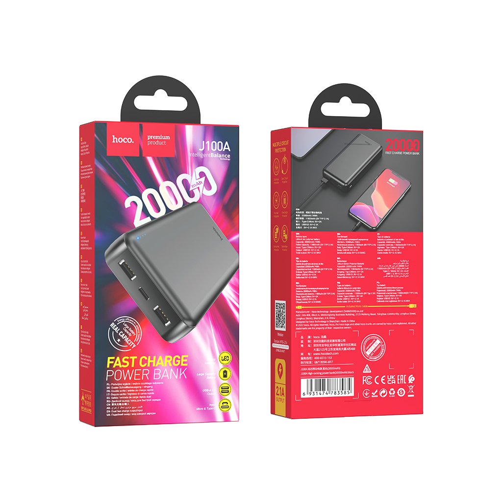 Externí baterie Hoco J100A vám poskytne velkou kapacitu pro nabíjení na cestách a další praktické funkce. Celkem 20 000 mAh dokáže dobít několikrát vaše zařízení a dva výstupní porty zajistí nabíjení dvou telefonů současně. LED diody ukazují zbývající energii a výhodou jsou i dvě různé možnosti dobití externí baterie.