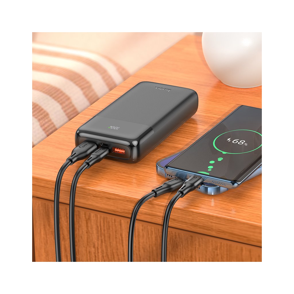 Externí baterie Hoco J121A Fast není žádný mrňous a důvodem je velká kapacita 20 000 mAh. Díky tomu můžete mnohonásobně nabít svůj telefon nebo tablet. Vedle těchto zařízení navíc nebude dělat rozhodně ostudu a nabíjet můžete rovnou 3 zařízení současně. Potěší i displej zobrazující zbývající energii powerbanky v procentech.