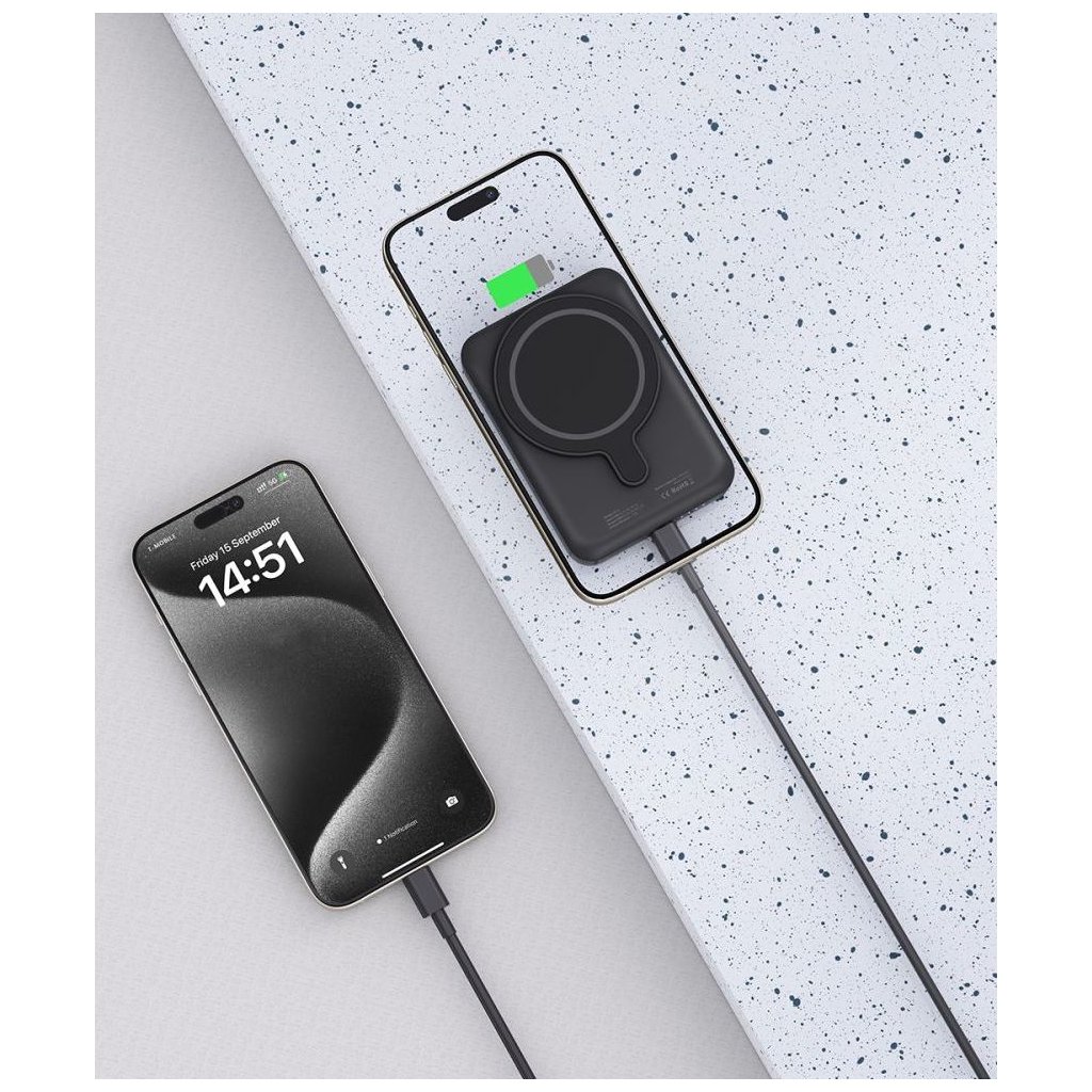 USB-C powerbanka zvládá drátově nabíjet až do nabíjecího výkonu 18 W. Znamená to, že dokáže dobíjet i třeba tablety, které USB-C konektorem disponují nebo prostě použijete kabel, který má na své druhé straně třeba Lightning konektor. MagSafe pak už jen vylepšuje bezdrátové nabíjení a na powerbanku se magneticky uchytí. Můžete tak snadno powerbanku s telefonem přenášet a iPhone stále používat.
