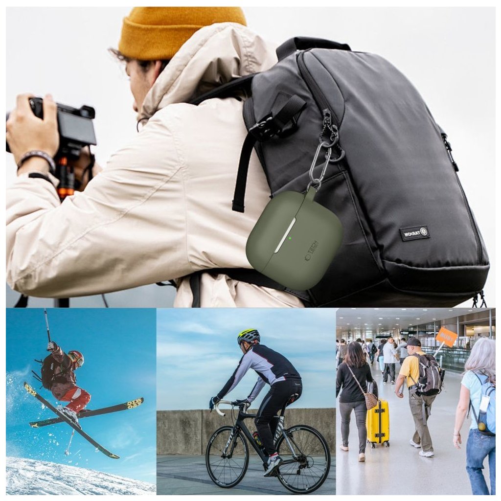 Pouzdro na sluchátka AirPods 4 s karabinou je vyrobeno z tenké gumy a výborně ochrání nabíjecí krabičku před poškrábáním a zničením. Sedí přesně na AirPods 4 a i v nasazeném krytu můžete využívat funkci bezdrátového nabíjení.