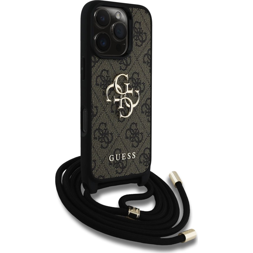 Ochranný kryt s crossbody popruhem na iPhone 16 Pro MAX - Guess, 4G PU Metal Logo Brown
