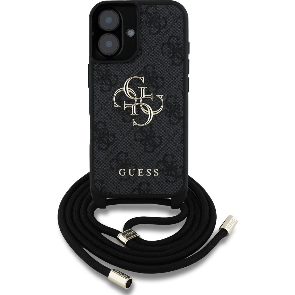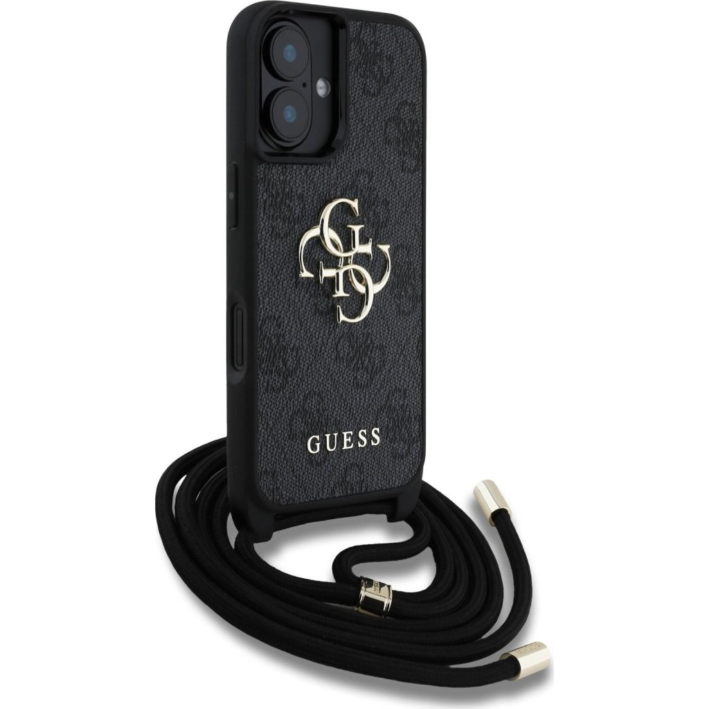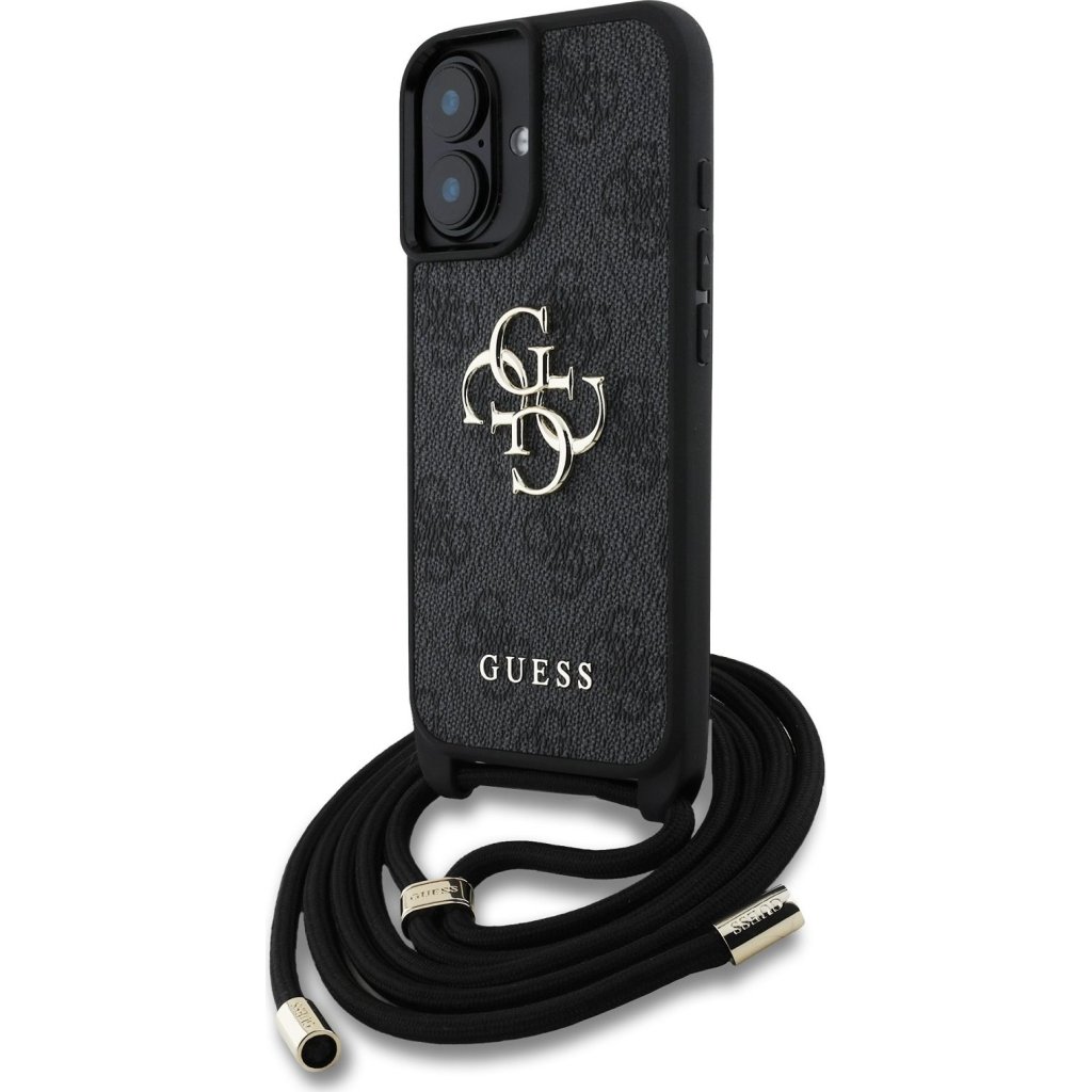 Ochranný kryt s crossbody popruhem na iPhone 16 - Guess, 4G PU Metal Logo Black