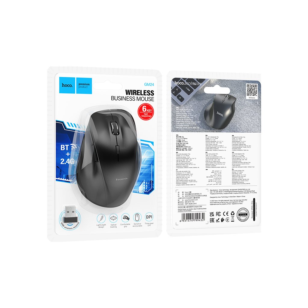 Bezdrátová myš Hoco GM24 vyniká svým univerzálním použitím a ergonomickým zpracováním. Myš připojíte ke každému počítači a pokud podporuje myš, tak také tabletu. Využít lze přiložený přijímač nebo bezdrátové bluetooth.