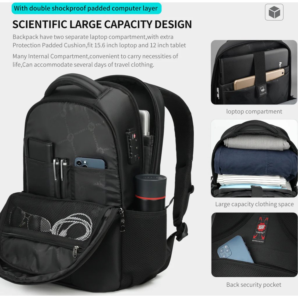 Městský batoh Tigernu T-B3105-3A nabídne množství prostoru pro uložení vašich cenností a místo pro až 15,6palcový notebook. Dvě velké kapsy se postarají o uložení všech věcí a měkké polstrování na zádech a popruzích zase o pohodlné nošení. Navíc jistě oceníte vnější nabíjecí USB port pro dobití telefonu nebo tabletu a integrovaný TSA zámek.