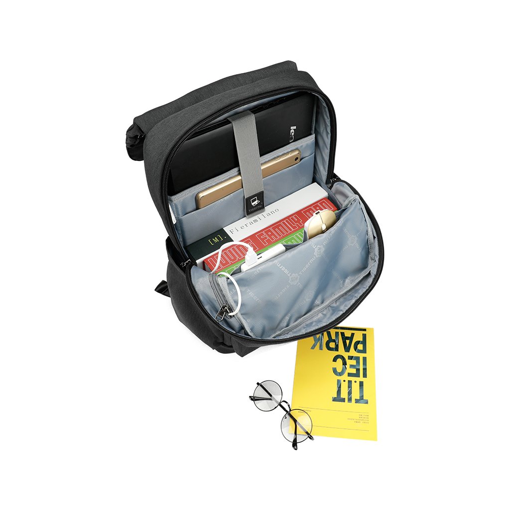 Batoh pro notebook Tigernu nabízí dostatek prostoru na přesun vašeho pracovního zařízení nebo školních potřeb a to i s dalším příslušenstvím. Bude se hodit na všechny příležitosti a uvnitř je více místa než na první pohled čekáte. Jedna velká kapsa slouží k bezpečnému uložení počítače a k němu můžete přidat spoustu doplňků jako jsou powerbanky, nabíječky nebo sešity, klávesnice nebo myš. Po otevření kapsy budete mít k dispozici mnoho přihrádek. Počítač zajistíte pružným popruhem na suchý zip. Malá kapsička na ramenním popruhu je jako dělaná pro uložení sluchátek, platební karty nebo kapesníku. Na druhém popruhu je praktické poutko na připnutí třeba brýlí.