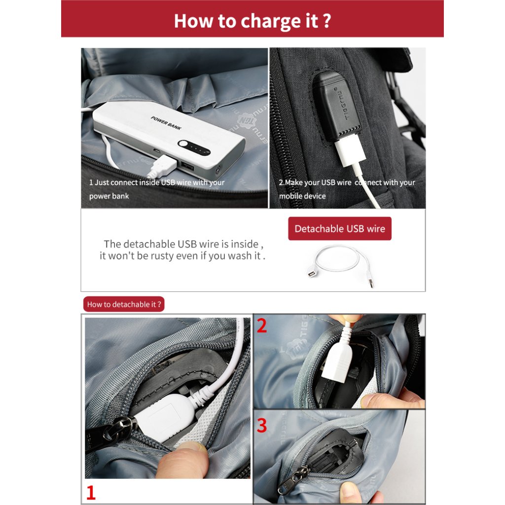 Pohodlný batoh je obdařen i nabíjecím USB portem. Ten je umístěn na straně a po připojení nabíjecího kabelu dobije váš telefon nebo tablet. Uvnitř se pak nachází propojovací kabel, který stačí zapojit do powerbanku a tu v batohu bezpečně uložit.