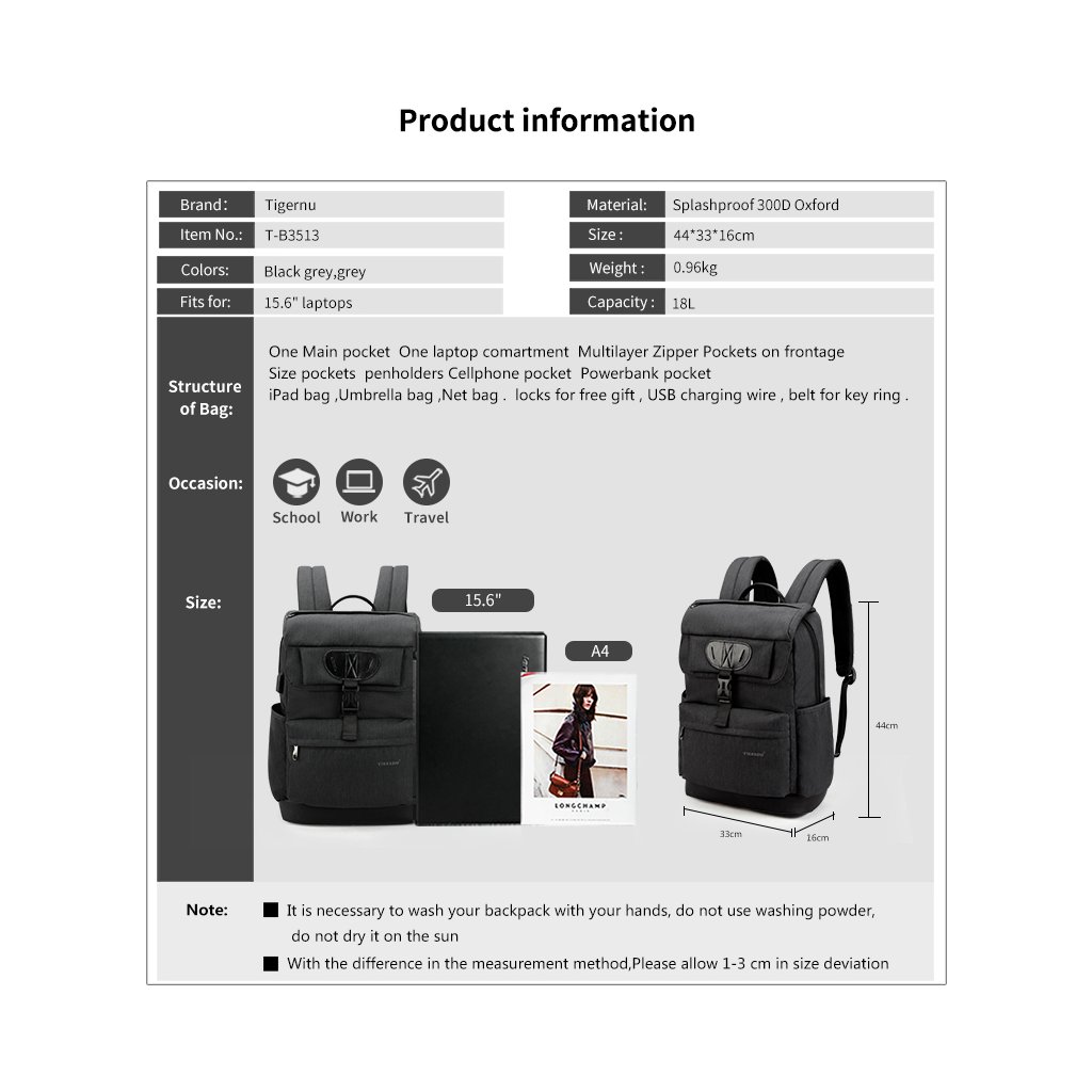 Městský batoh Tigernu T-B3513 využijete na všechny příležitosti. Ať už jdete do práce, do školy nebo na jednání. Vejde se do něj notebook s úhlopříčkou obrazovky až 15,6 palců. Dokonce máte k dispozici nabíjecí USB port pro doplnění energie vašemu telefonu nebo tabletu.