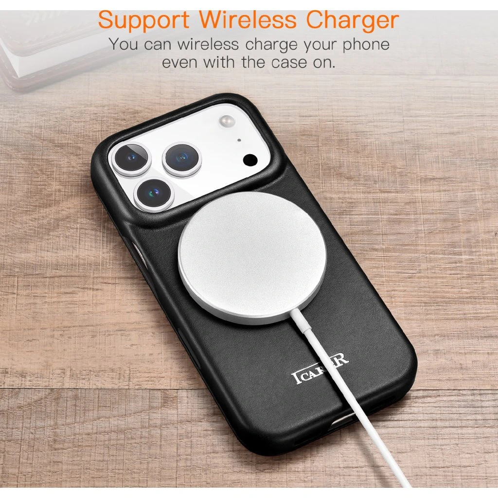 iCarer Oil Wax Real Leather Folio je přesně navržen danému modelu. Také je možné při nasazeném kryt nabíjet iPhone bezdrátově.