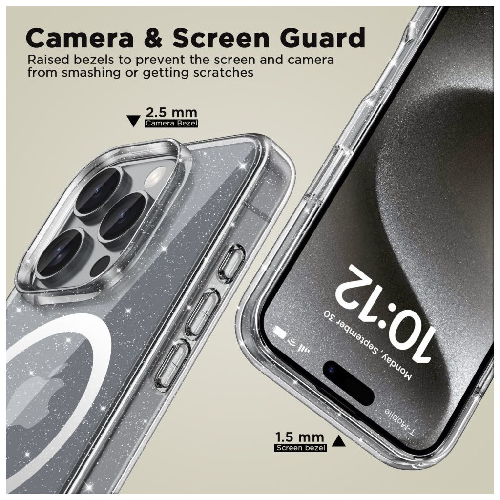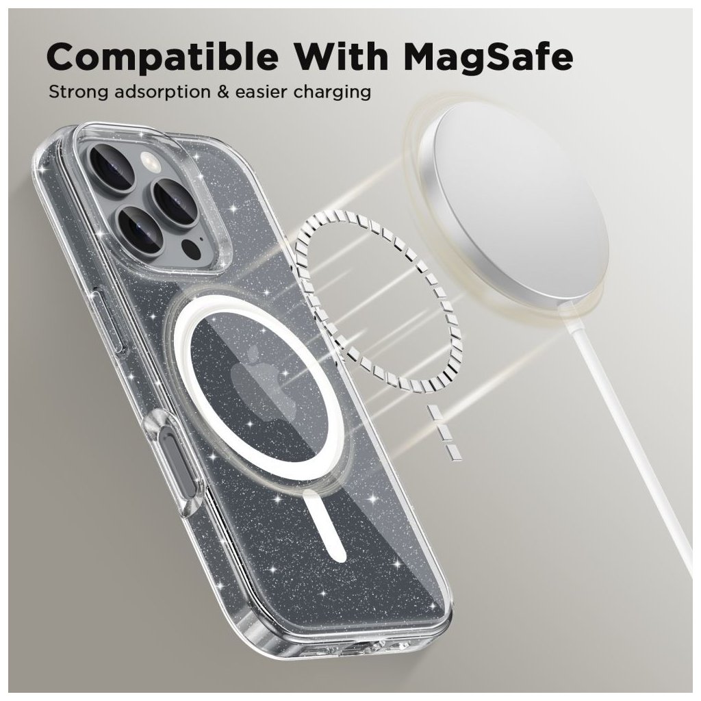 Tenký MagSafe kryt na iPhone nezvyšuje objem telefonu a ani nepoznáte, že je pouzdro nasazené. V kapse nebo kabelce se rozhodně jeho malé rozměry ztratí, ale dokáže ochránit telefon před nehezkými škrábanci nebo při menších pádech. Hybridní konstrukce kombinuje pevný polykarbonát a odolný pružný TPU rám kolem těla telefonu. Celek poskytne vynikající ochranu před poškrábáním a poškozením při zachování tenkého a lehkého designu. V celých zádech jsou pak zakomponované třpytivé prvky, glittery, které dávají krytu unikátní vzhled.