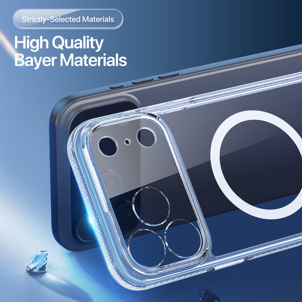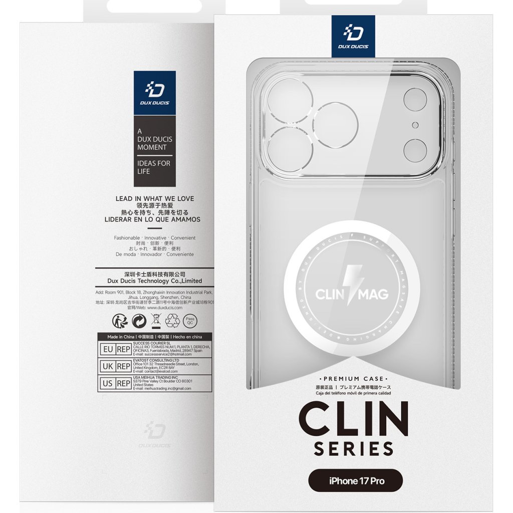 Ochranný kryt pro iPhone DuxDucis Clin je průhledným krytem, který telefon udrží v bezpečí. Příjemný obal poskytuje velmi dobrou ochranu a nechává vyniknout design samotného telefonu. Kromě zad ochrání i objektivy fotoaparátu a displej mobilu. Navíc je vzadu integrovaný magnet pro používání MagSafe nabíjení.