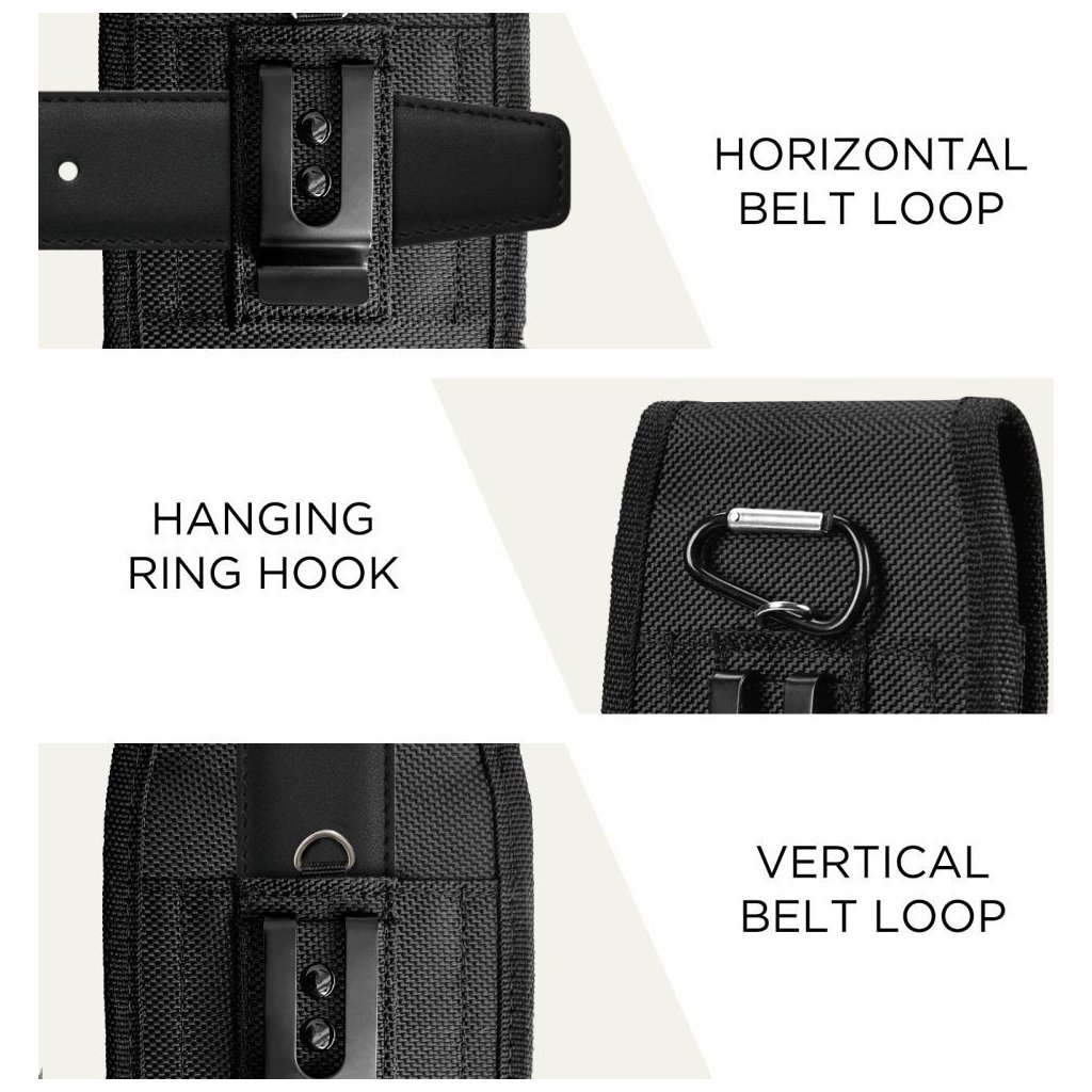 Dvojitě prošité poutka na opasek umožňují nošení pouzdra na výšku nebo na šířku, a přiložený kovový karabina umožňuje připnutí pouzdra k batohu, tašce nebo opasku. Díky tomu si uživatel může vybrat nejpohodlnější způsob nošení přizpůsobený svým potřebám. Pouzdro je kompatibilní s většinou smartphonů s úhlopříčkou obrazovky od 5,8 do 6,8 palců.