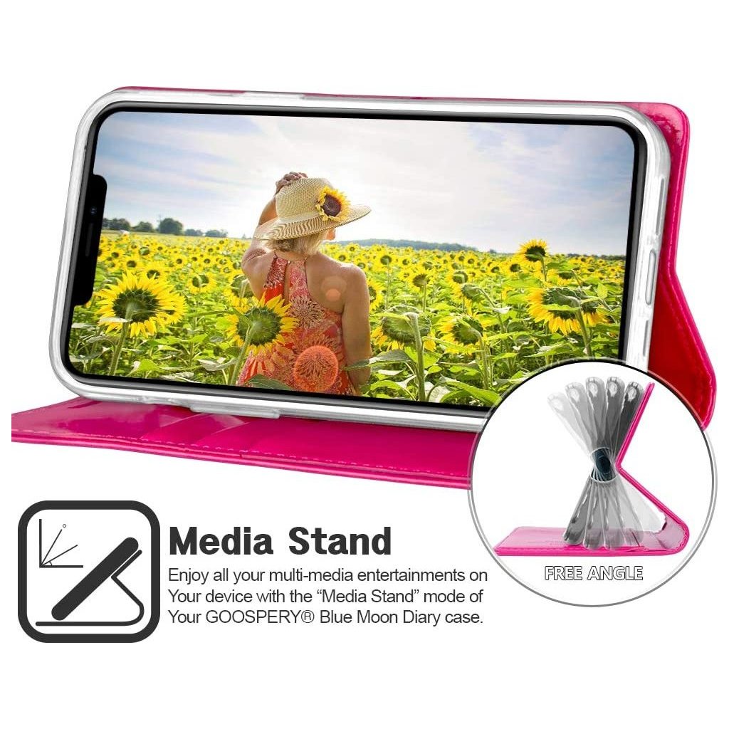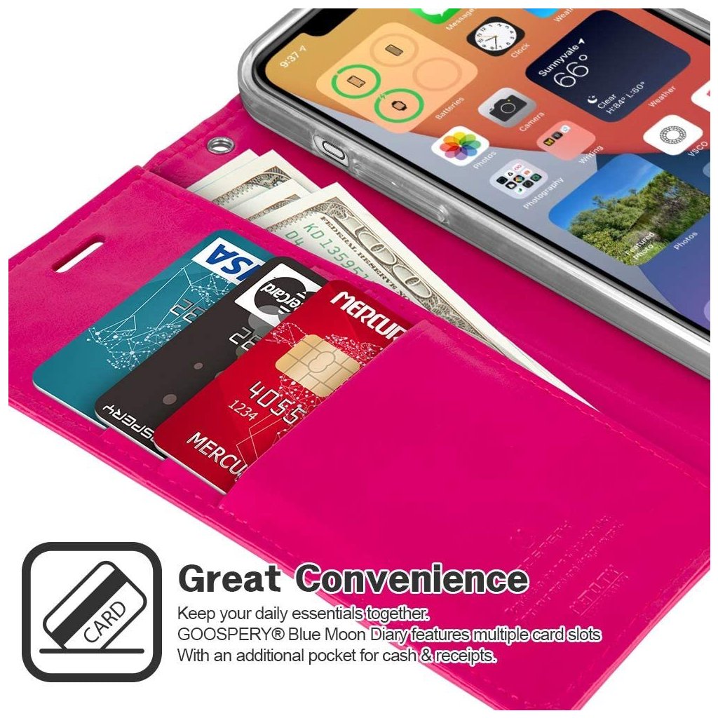 Ochranné pouzdro na iPhone Mercury Bluemoon Diary je zavírací elegantní kryt pro Apple telefony. Příjemný obal plní kromě ochranné funkce také použití jako stojánku nebo přihrádky pro uložení drobné hotovosti.