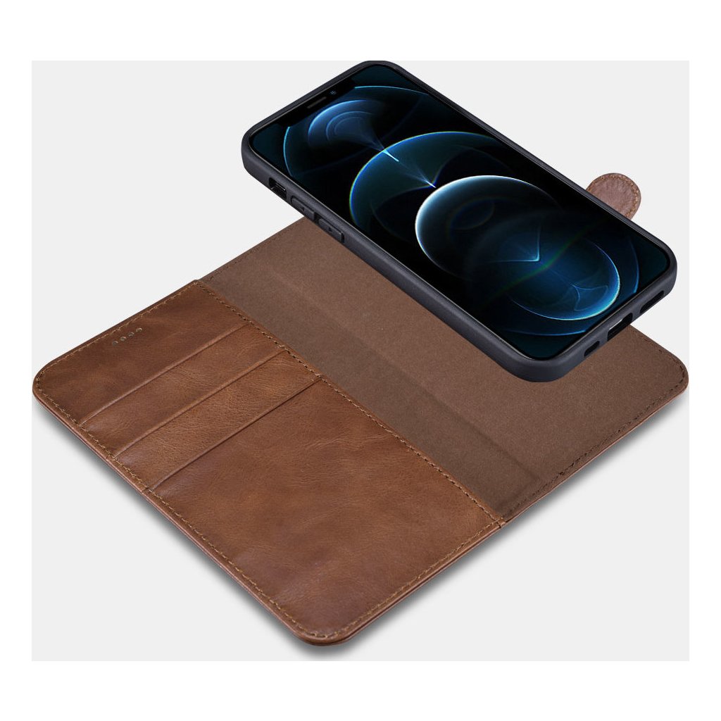 Kožené pouzdro na iPhone 12 Pro MAX - iCarer, Crazy Horse 2in1 with RFID Coffee