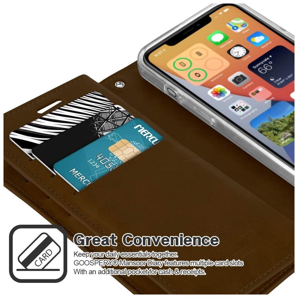 Ochranné pouzdro na iPhone Mercury Mansoor Diary je zavírací elegantní kryt pro Apple telefony. Příjemný obal plní kromě ochranné funkce také použití jako peněženky, protože má přihrádky pro uložení drobné hotovosti nebo platebních karet.