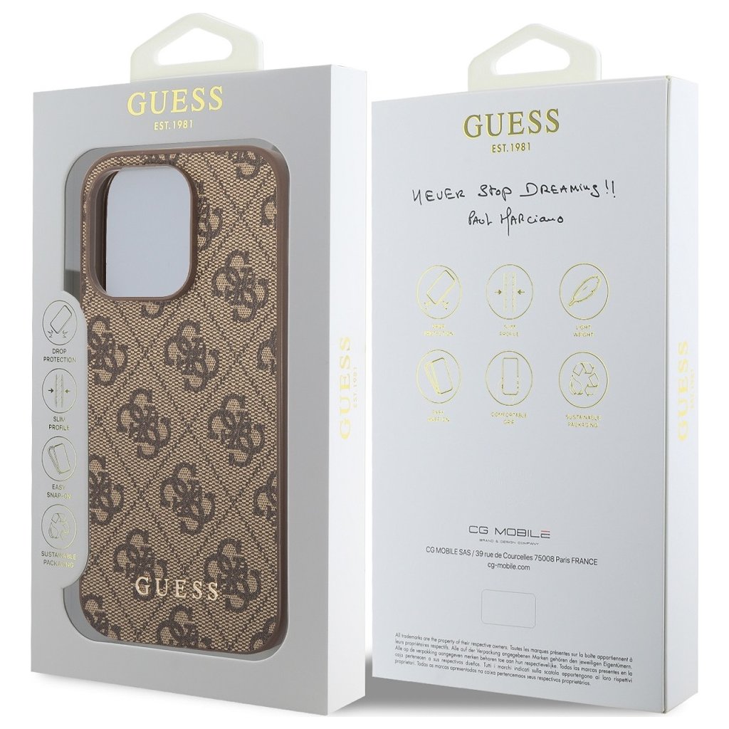 Prémiový zadní kryt Guess 4G Charm se vyznačuje elegantním, charakteristickým 4G vzorem, doplněným o zlaté logo GUESS.