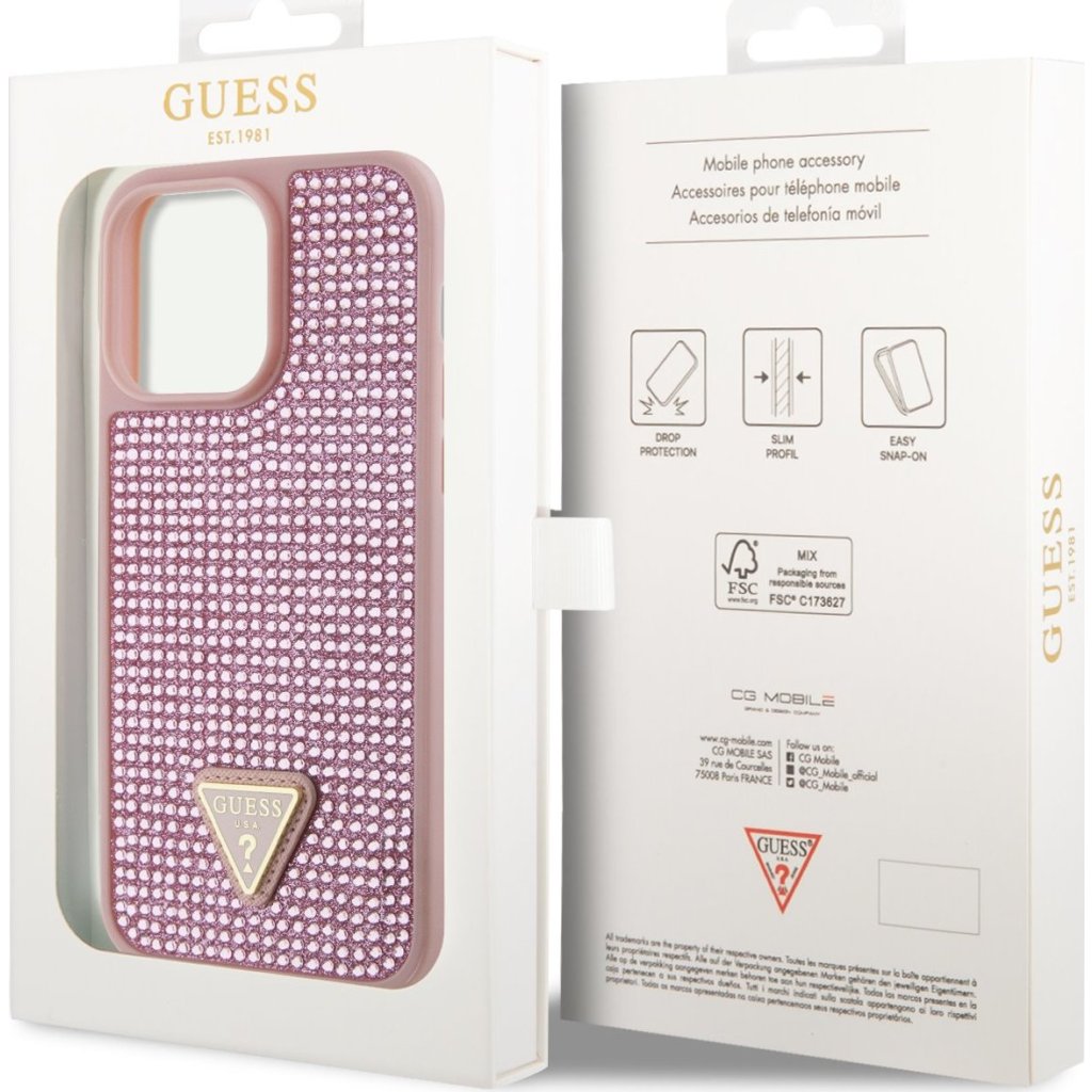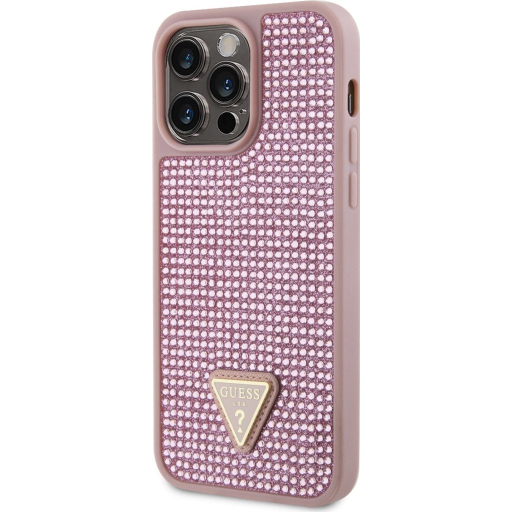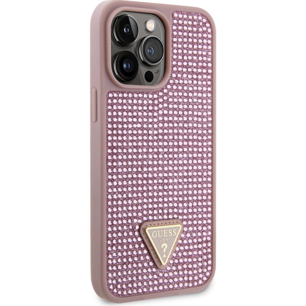 Ochranný kryt pro iPhone 14 Pro MAX - Guess, Rhinestones Triangle Metal Logo Pink